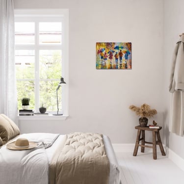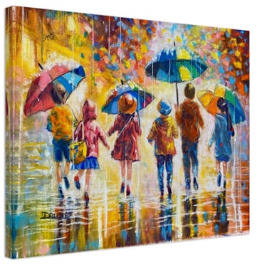 As you gaze upon this painting, you can almost hear the gentle patter of rain and feel the camaraderie shared under the shelter of colorful canopies. It's more than a painting; it's a celebration of life's simple pleasures, a reminder to find joy even on the rainiest of days.