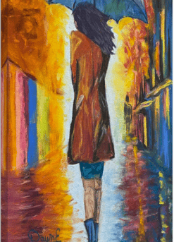 Each stroke of DawnE's pastels brings to life the vibrant energy of the scene—a cascade of crimson, amber, and gold enveloping a solitary figure under a cobalt blue umbrella. The rhythmic movement in the artwork is almost musical, as if the colors themselves are performing a delicate waltz on the canvas.