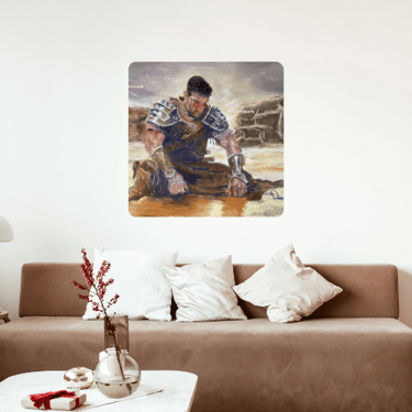 Kneeling upon the golden sands, the warrior's muscular form is both grounded and weary, his head bowed in a moment of silent introspection. The soft, earthy tones of the background suggest a desolate battlefield, enhancing the sense of solitude.